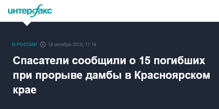 Москва. 19 октября. INTERFAX.RU - По последним данным, число погибших при прорыве дамбы в Красноярском крае возросло до пятнадцати, сообщили "Интерфаксу" в субботу в МЧС России.