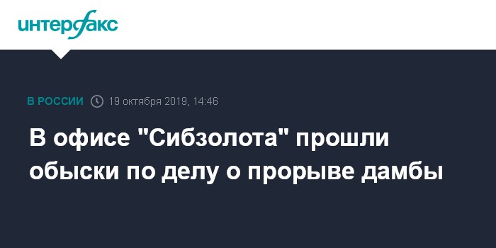 Москва. 19 октября. INTERFAX.RU - Сотрудники следственных органов провели обыски в офисе холдинга "Сибзолото" в рамках расследования уголовного дела о прорыве дамбы в Красноярском крае, сообщил "Интерфаксу" в субботу информированный источник.
