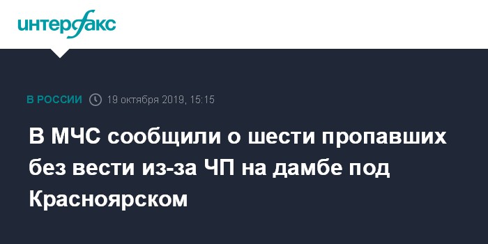 Москва. 19 октября. INTERFAX.RU - Шесть человек остаются пропавшими без вести после прорыва дамбы в Красноярском крае, сообщили "Интерфаксу" в субботу в МЧС России.