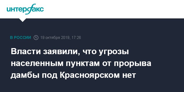 Москва. 19 октября. INTERFAX.RU - Прорыв дамбы на золотодобывающей артели в Красноярском крае не угрожает другим населенным пунктам, сообщил журналистам в субботу глава правительства Красноярского края Юрий Лапшин.