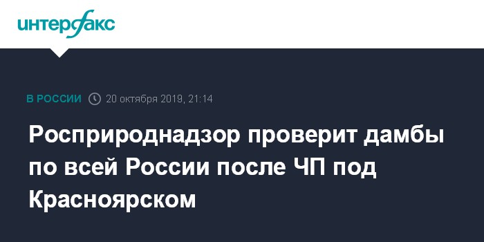 Москва. 20 октября. INTERFAX.RU - Росприроднадзор проведет проверку всех дамб в России после трагедии в Красноярском крае, обращение в правительство РФ будет направлено в понедельник, сообщили "Интерфаксу" в пресс-службе ведомства.