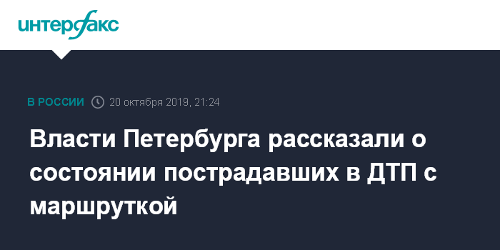Москва. 20 октября. INTERFAX.RU - Состояние пострадавших в результате столкновения маршрутки и трамвая в Петербурге оценивается как средней степени тяжести, сообщили "Интерфаксу" в аппарате вице-губернатора Анны Митяниной в воскресенье.
