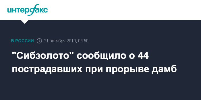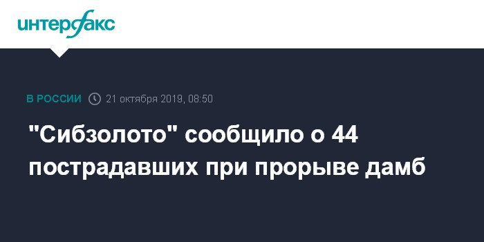 Москва. 21 октября. INTERFAX.RU - В результате прорыва пяти дамб на реке Сейба в поселке золотодобывающей артели "Сисим" пострадали 44 человека, девять из них госпитализированы в тяжелом состоянии. Об этом сообщил холдинг "Сибзолото", в структуру которого входит "Сисим".