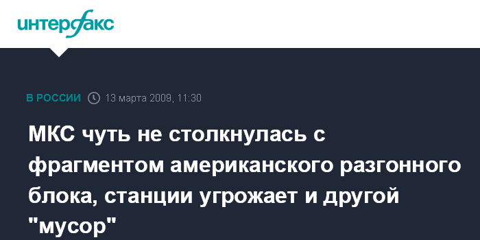 По словам собеседника агентства, в четверг вечером вблизи станции пролетел фрагмент американского разгонного блока, который в 1993 году вывел на орбиту один из спутников навигационной системы GPS. Относительная скорость сближения станции и "космического мусора" равнялась 9 км/с. Он добавил, что угрожавший МКС объект все еще продолжает полет по своей орбите.