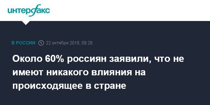 Москва. 22 октября. INTERFAX.RU - Большинство россиян (58%) полагают, что не имеют никакого влияния на происходящее в стране, свидетельствуют данные опроса "Левада-центра", поступившие в "Интерфакс".