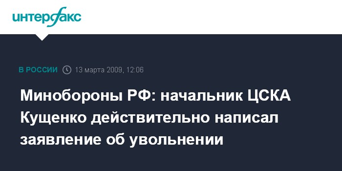 Москва. 13 марта. INTERFAX.RU - В Минобороны России официально подтвердили, что начальник Федерального государственного учреждения МО РФ "Центральный спортивный клуб Армии" Сергей Кущенко написал заявление об увольнении с занимаемой должности.