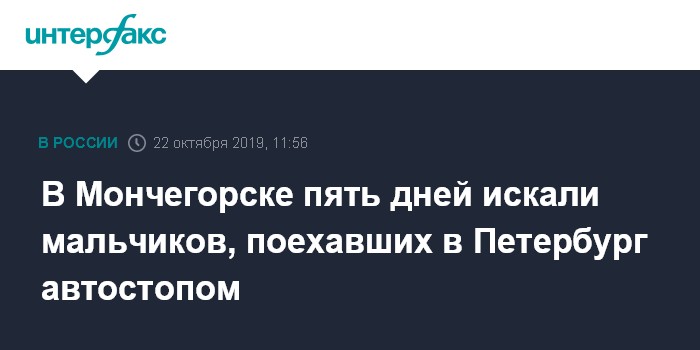 Москва. 22 октября. INTERFAX.RU - Двух 12-летних мальчиков, которые пропали в Мончегорске на прошлой неделе и которых искали пять дней, нашли в понедельник в Петербурге. Об этом сообщили в управлении СКР по Мурманской области.