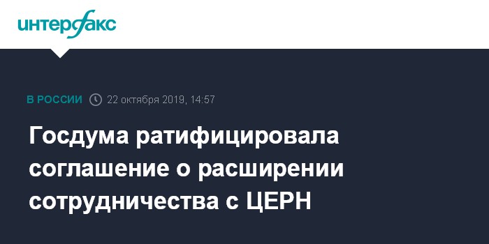 Как было указано пояснительной записке к законопроекту, соглашение с ЦЕРН о научно-техническом сотрудничестве в области физики высоких энергий и иных сферах взаимного интереса и протокол к нему были подписаны в апреле в Женеве.