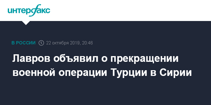 Москва. 22 октября. INTERFAX.RU - Военная операция Турции на северо-востоке Сирии прекращается, заявил глава МИД РФ Сергей Лавров по итогам переговоров в Сочи президентов России и Турции.