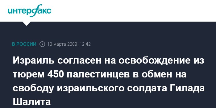 Москва. 13 марта. INTERFAX.RU - Израиль согласился освободить всех 450 заключенных, освобождения которых требует палестинское движение ХАМАС, в обмен на свободу удерживаемого им израильского солдата Гилада Шалита, сообщает в пятницу израильская газета "Гаарец", которая ссылается на палестинские источники в Каире.