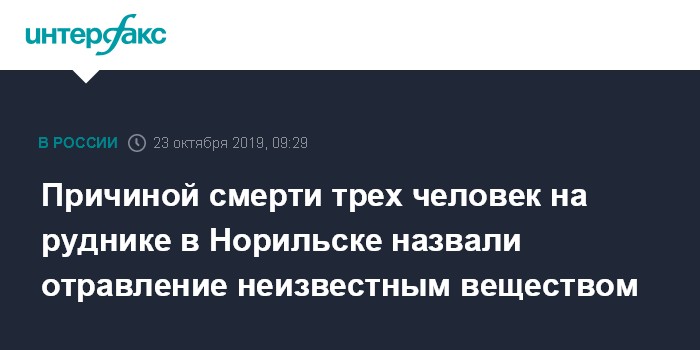 Москва. 23 октября. INTERFAX.RU - Следователи считают предварительной причиной смерти трех рабочих в шахте рудника "Таймырский" отравление неустановленным веществом, сообщает пресс-служба Главного следственного управления СКР по Красноярскому краю.