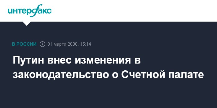 Москва. 31 марта. INTERFAX.RU - Президент России Владимир Путин подписал закон "О внесении изменений в статьи 5 и 6 федерального закона "О Счетной палате Российской Федерации", сообщила пресс-служба Кремля. Закон предусматривает, что предложения о кандидатах на должность аудиторов Счетной палаты, назначаемых парламентом, могут вноситься президенту РФ комитетами и комиссиями, а также не менее 1/5 от общего числа членов Совета Федерации и Госдумы.