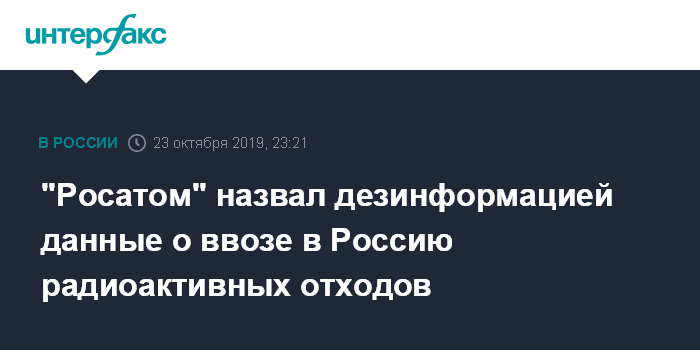 Москва. 23 октября. INTERFAX.RU - В "Техснабэкспорте" (входит в госкорпорацию "Росатом") назвали дезинформацией заявление "Гринпис" о ввозе в Россию из Германии радиоактивных отходов.