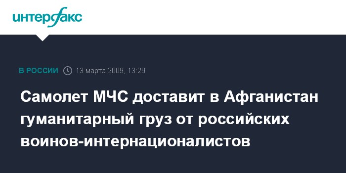 Москва. 13 марта. INTERFAX.RU - МЧС России направляет населению Афганистана очередной груз гуманитарной помощи. "В ночь с пятницы на субботу самолет Ил-76 МЧС России доставит в Кабул 40 тонн гуманитарной помощи, предоставленной общественными организациями воинов-интернационалистов и Росрезервом", - сообщил "Интерфаксу" в пятницу представитель Управления информации МЧС. В составе гуманитарного груза - самое необходимое для афганского населения - от продуктов питания и медикаментов до палаток и одежды, отметили в МЧС.