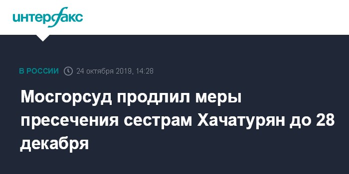 Москва. 24 октября. INTERFAX.RU - Мосгорсуд продлил до 28 декабря меры пресечения трем сестрам Хачатурян, которых обвиняют в убийстве отца в июле 2018 года. Об этом сообщил представитель суда. Сестры с конца сентября 2018 года находятся дома, но обязаны соблюдать ряд ограничений.