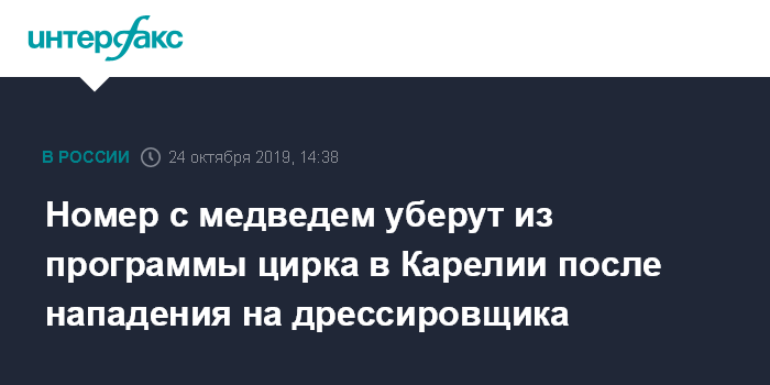Москва. 24 октября. INTERFAX.RU - Цирк после нападения медведя на дрессировщика во время представления продолжит гастроли по Карелии, но без опасного животного, сообщила "Интерфаксу" администратор шапито Людмила Мисник.