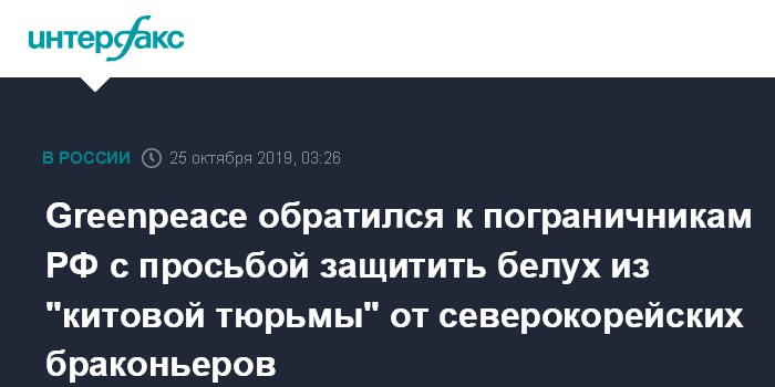 "В этой части Японского моря сейчас большая проблема - сотни северокорейских судов ведут браконьерский промысел рыбы и морепродуктов в экономической зоне и территориальных водах России. Greenpeace обращается к Пограничной службе России с просьбой защитить белух от вылова нелегальными северокорейскими рыбаками", - заявил эксперт Greenpeace России Оганес Таргулян, слова которого приводятся в релизе экологической организации.