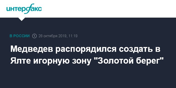 Москва. 28 октября. INTERFAX.RU - Премьер-министр РФ Дмитрий Медведев распорядился создать в Ялте игорную зону "Золотой Берег".