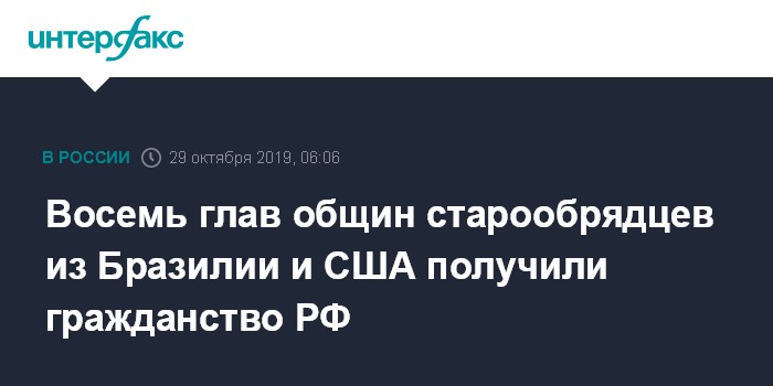 Москва. 29 октября. INTERFAX.RU - Указом президента РФ восемь глав старообрядческих общин из Бразилии и США приняты в гражданство Российской Федерации, сообщила пресс-служба Агентства по развитию человеческого капитала на Дальнем Востоке (АРЧК ДВ).