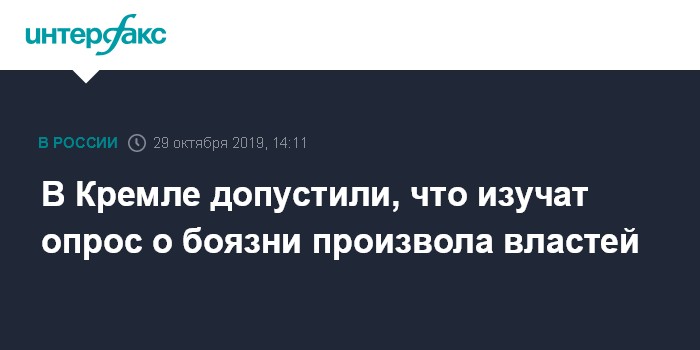 Москва. 29 октября. INTERFAX.RU - В Кремле обращают внимание на соцопросы и, возможно, изучат исследование "Левада-центра" о том, что боязнь произвола властей вошла в топ-3 страхов россиян. Об этом заявил пресс-секретарь президента Дмитрий Песков.