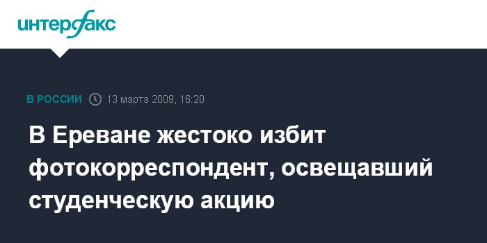 Ереван. 13 марта. INTERFAX.RU - В Ереване в пятницу избит фотокорреспондент ереванских газет "Утро" и "Четвертая власть" Гагик Шамшян.