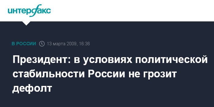 Москва. 13 марта. INTERFAX.RU - Скоординированная работа властей всех уровней и политическая стабильность в России гарантируют стране избежание дефолта, заявил в пятницу президент РФ Дмитрий Медведев на заседании Совета законодателей.