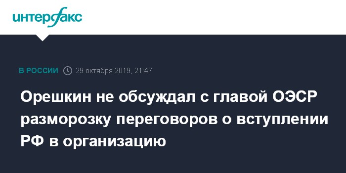 Москва. 29 октября. INTERFAX.RU - Министр экономического развития РФ Максим Орешкин на встрече в Париже обсудил с главой Организации экономического сотрудничества и развития Анхелем Гурриа углубление сотрудничества по ряду направлений, но тема "разморозки" переговоров о присоединении России к ОЭСР не поднималась, сообщил Орешкин журналистам.
