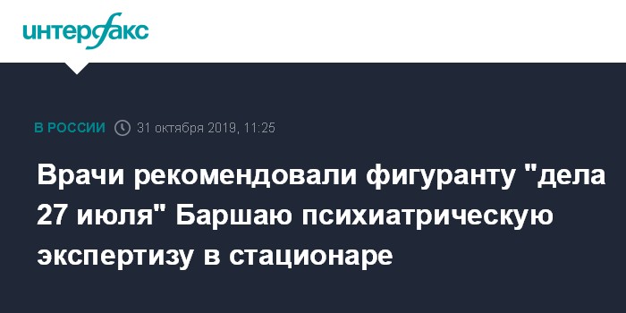Москва. 31 октября. INTERFAX.RU - Врачи психиатрической больницы №1 имени Алексеева рекомендовали фигуранту "дела 27 июля" Андрею Баршаю психолого-психиатрическую экспертизу в стационаре "в связи с неясностью клинической картины", написал в телеграм глава "Агоры" Павел Чиков и опубликовал фрагмент медицинского документа.