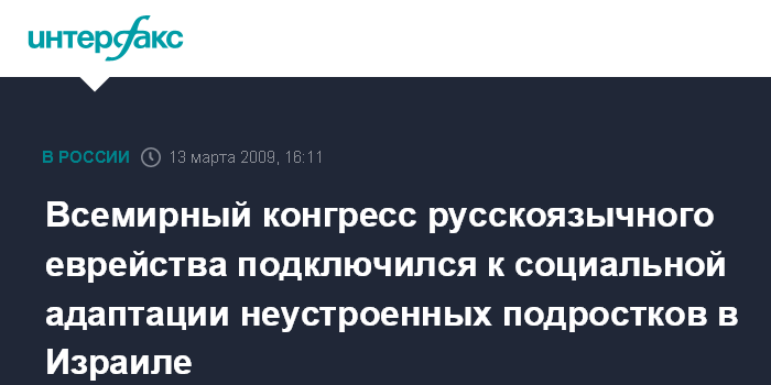 Москва. 13 марта. INTERFAX.RU - Всемирный конгресс русскоязычного еврейства принимает участие в программе, цель которой - помочь социально неустроенным подросткам Израиля (выходцам из России) найти достойное место в обществе.