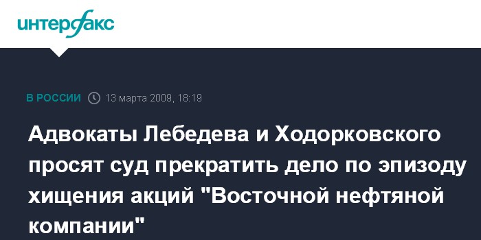 Москва. 13 марта. INTERFAX.RU - Адвокаты экс-главы НК "ЮКОС" Михаила Ходорковского и бывшего главы МФО "МЕНАТЕП" Платона Лебедева заявили ходатайство в суде о прекращении уголовного дела по эпизоду хищения акций "Восточная нефтяная компания" за истечением срока давности.