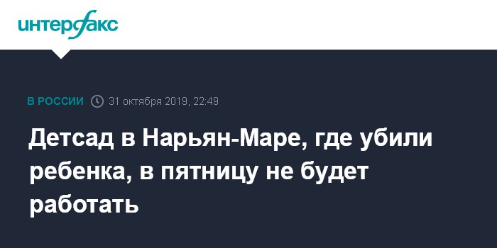 Москва. 31 октября. INTERFAX.RU - Детский сад "Сказка", где в четверг был убит шестилетний ребенок, будет закрыт для посещения в пятницу, сообщила пресс-служба администрации Ненецкого автономного округа (НАО).