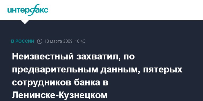 Ленинск-Кузнецкий. 13 марта. INTERFAX.RU - Пятеро сотрудников отделения "Урса-банка" в Ленинске-Кузнецком (Кузбасс), по предварительным данным, оказались захвачены в заложники неизвестным вечером в пятницу.