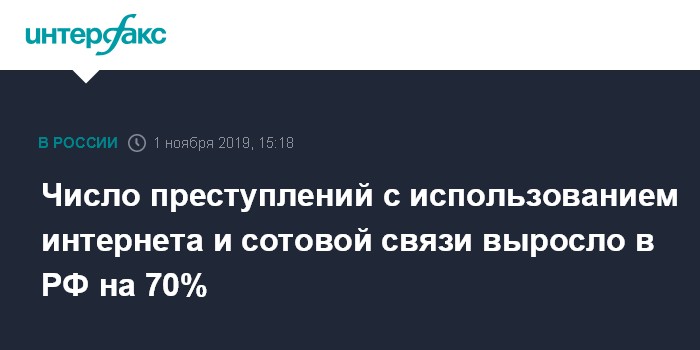 Москва. 1 ноября. INTERFAX.RU - Глава МВД России Владимир Колокольцев сообщил, что число преступлений с использованием интернета и сотовой связи выросло на 70% в январе-сентябре 2019 года по сравнению с аналогичным периодом прошлого года.