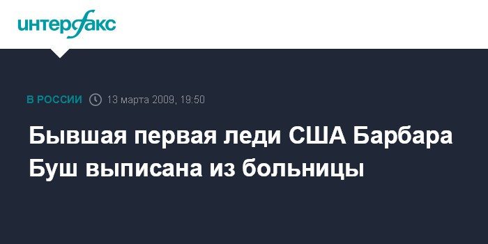 Нью-Йорк. 13 марта. INTERFAX.RU - Жена бывшего президента США Джорджа Буша-старшего, Барбара Буш, в пятницу была выписана из больницы в Хьюстоне (штат Техас), в которой находилась последние девять дней после операции по замене аортального клапана, сообщает газета "Хьюстон кроникл".