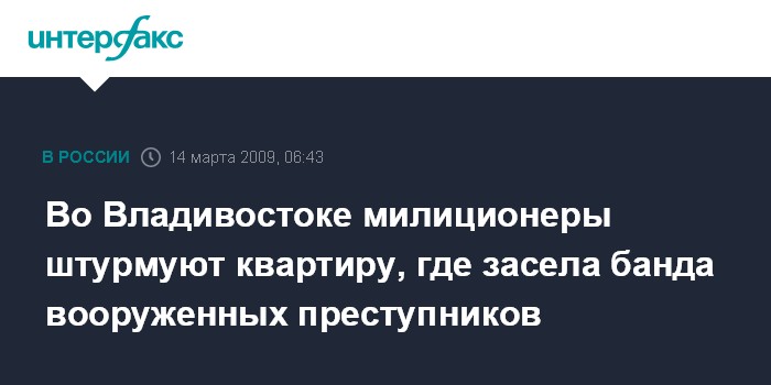 Владивосток. 14 марта. ИНТЕРФАКС-ДАЛЬНИЙ ВОСТОК - Несколько бандитов, которых подозревают в разбойном нападении на китайских предпринимателей, сегодня с утра забаррикадировались в одной из квартир жилого дома по улице Красного знамени дом 99, в центральной части Владивостока, и оказывают вооруженное сопротивление милиции.