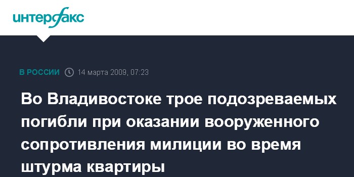 Владивосток. 14 марта. ИНТЕРФАКС-ДАЛЬНИЙ ВОСТОК - Во Владивостоке трое бандитов, которых подозревают в разбойном нападении на китайских предпринимателей, были убиты в перестрелке сотрудниками милиции в ходе штурма одной из квартир жилого дома 99 по улице Красного знамени.