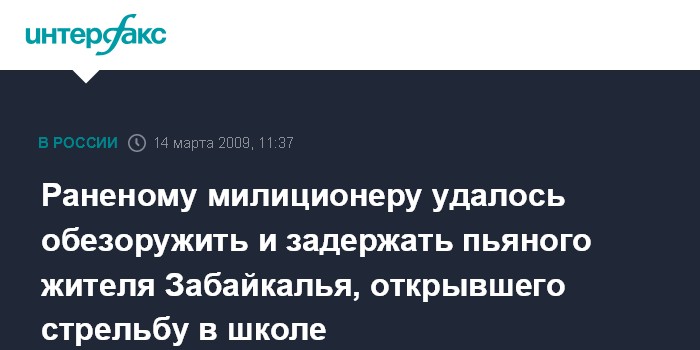 Москва. 14 марта. INTERFAX.RU - В городе Шилка Забайкальского края задержан нетрезвый 20-летний местный житель, устроивший стрельбу в средней школе и ранивший милиционера.