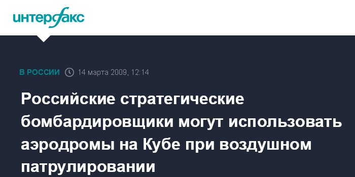 Москва. 14 марта. INTERFAX.RU - В командовании Дальней авиации не исключают, что территория Кубы может быть использована для базирования стратегических бомбардировщиков ВВС России при выполнении ими задач воздушного патрулирования в различных регионах мира.