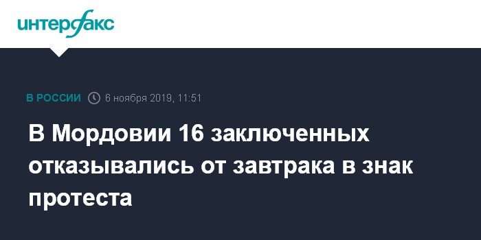 Москва. 6 ноября. INTERFAX.RU - Управление ФСИН по Мордовии опровергло информацию СМИ о 70 заключенных колонии номер 7 республики, которые якобы объявили голодовку, отметив, что от завтрака отказались только 16 осужденных.