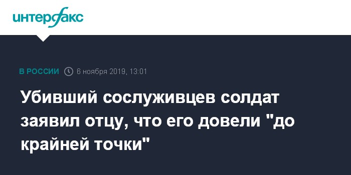 Москва. 6 ноября. INTERFAX.RU - Солдат-срочник Рамиль Шамсутдинов, расстрелявший в октябре восемь человек в воинской части в Забайкальском крае, на встрече с отцом в СИЗО рассказал, что его довели "до крайней точки".