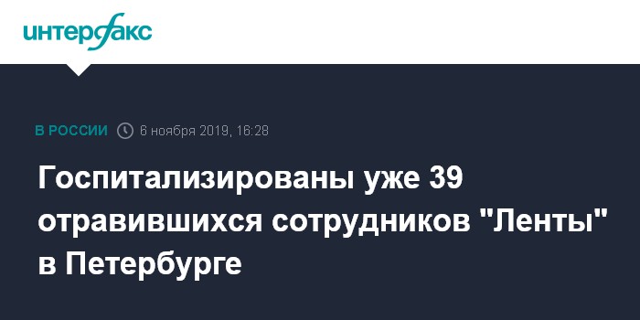 Москва. 6 ноября. INTERFAX.RU - В Петербурге количество сотрудников ритейлера "Лента", которым потребовалась госпитализация после отравления в служебной столовой, достигло 39. Об этом сообщили в городском управлении Роспотребнадзора.