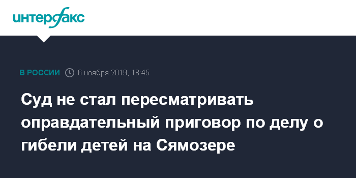 Москва. 6 ноября. INTERFAX.RU - Третий кассационный суд отказался рассматривать представление прокуратуры по оправдательному приговору инструктору лагеря "Сямозеро" Валерию Круподерщикову и бывшему инструктору парк-отеля "Сямозеро" Павлу Ильину по делу о гибели 14 детей, сообщается на сайте суда.