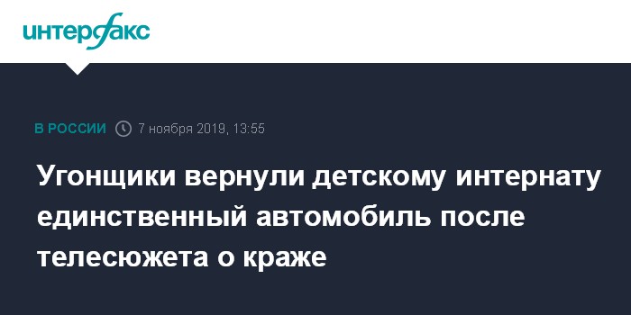 Москва. 7 ноября. INTERFAX.RU - В Ингушетии в селе Троицкое угнали единственный автомобиль интерната для детей-инвалидов. Машину вернули после спецрепортажа об угоне, который вышел в эфир телекомпании "Ингушетия", рассказали в интернате.
