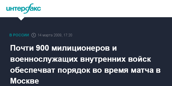 Москва. 14 марта. INTERFAX.RU - Охрану правопорядка во время матча Чемпионата России по футболу Премьер-лиги между командами "Локомотив" (Москва) и "Химки" (Московская область) обеспечат около 870 сотрудников милиции и солдат Внутренних войск, сообщили "Интерфаксу" в Управлении информации и общественных связей ГУВД столицы.