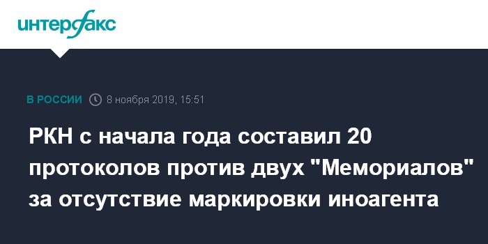 По данным пресс-службы, из-за несоблюдения требований закона об НКО Роскомнадзор с начала 2019 года составил по ч. 2 ст. 19.34 КоАП РФ: 14 протоколов в отношении Международной общественной организации "Международное историко-просветительское, благотворительное и правозащитное общество "Мемориал" (семь протоколов в отношении юрлица и семь протоколов в отношении физлица - председателя правления организации Яна Рачинского) и шесть протоколов в отношении Межрегиональной общественной организации Правозащитный Центр "Мемориал" (три протокола в отношении юрлица и три - в отношении физлица - председателя совета организации Александра Черкасова).
