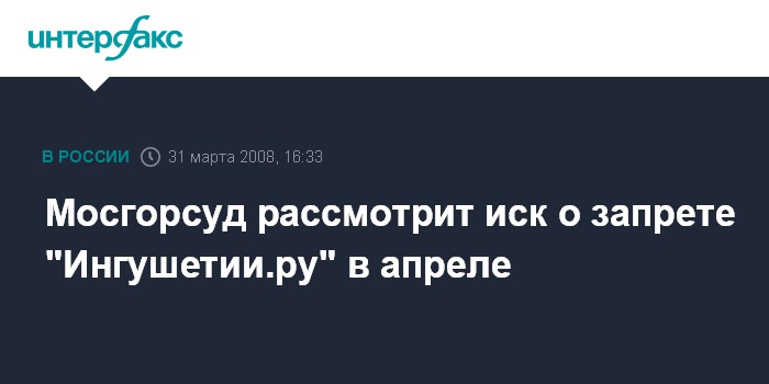 Москва. 31 марта. INTERFAX.RU - Мосгорсуд рассмотрит по существу иск прокуратуры Ингушетии о запрете деятельности сайта "Ингушетия.ру" 11 апреля. Владельцев сайта подозревают в распространении материалов экстремистского характера.