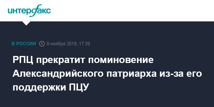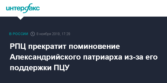 "Русская православная церковь глубоко опечалена информацией о решении Александрийского патриарха Феодора признать Епифания Думенко в качестве руководителя "Православной церкви Украины" и поминовением его имени в диптихах Александрийской церкви. Это означает, что поминовение имени Александрийского патриарха не сможет продолжаться при совершении патриарших богослужений в Русской православной церкви", - сказал "Интерфаксу" в пятницу замглавы синодального Отдела внешних церковных связей протоиерей Николай Балашов.