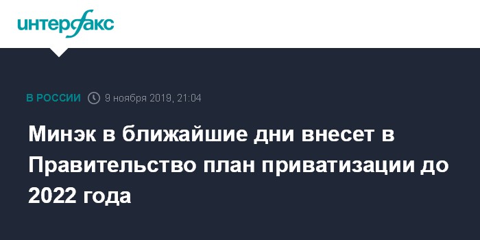 Москва. 9 ноября. INTERFAX.RU - Минэкономразвития в ближайшие дни внесет в правительство план приватизации на 2020-2022 гг, сообщила журналистам замминистра экономического развития Оксана Тарасенко, курирующая в министерстве тему приватизации.