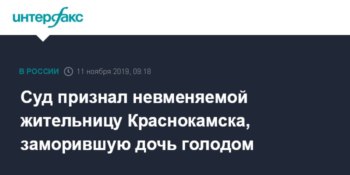Москва. 11 ноября. INTERFAX.RU - Пермский краевой суд признал невменяемой жительницу Краснокамска, чья дочь умерла от голода в 14 лет. Подсудимой назначили принудительное лечение, сообщили в пресс-службе суда.