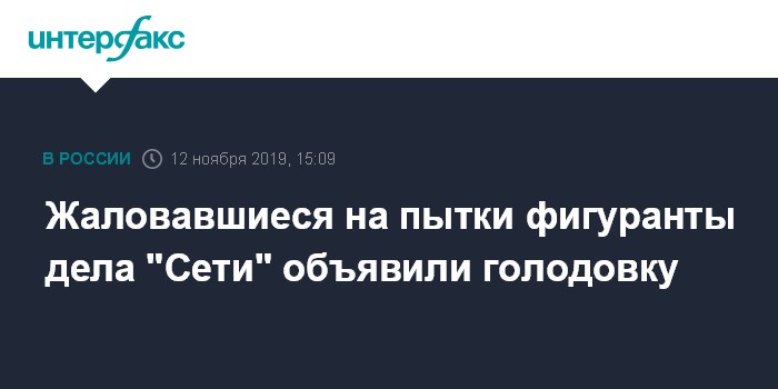 Москва. 12 ноября. INTERFAX.RU - Фигуранты дела террористической организации "Сеть" (запрещено в России) Арман Сагынбаев, Дмитрий Пчелинцев и Максим Иванкин объявили голодовку, сообщил лидер движения "За права человека" Лев Пономарев. По его словам, они требуют, чтобы были расследованы их жалобы на пытки со стороны сотрудников спецслужб.